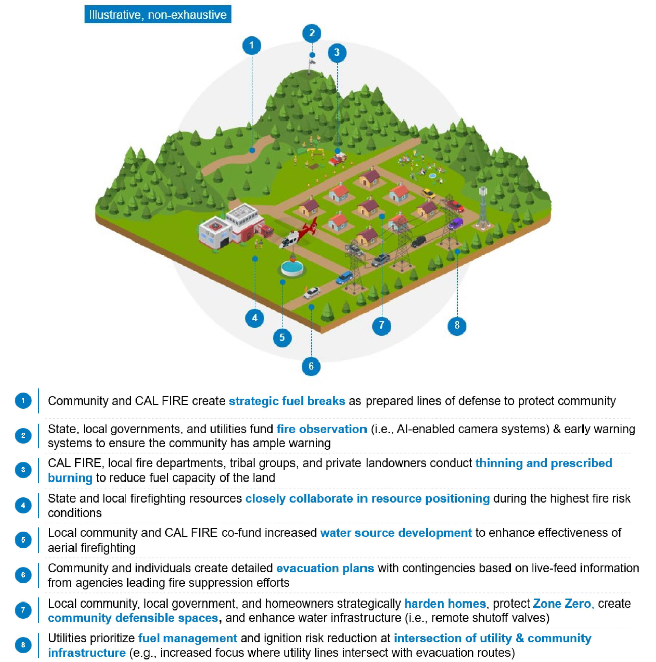 A key theme and takeaway from the SB 254 Report – one which underlies multiple recommended actions – is that the only way the state can achieve durable wildfire resilience is to increase wildfire mitigation via actions including home and community hardening, defensible space, and landscape-scale vegetation management. Figure 3, from the investor-owned utilities submission to the SB 254 Report process, nicely illustrates the combination of actions needed to achieve community wildfire mitigation.
