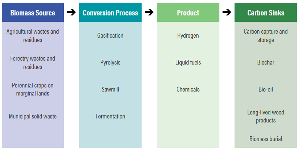 Compared to SB 1279, which focuses more on the wildland-urban interface and urban areas, AB 1666 would support wildfire mitigation in forested landscapes. Additionally, it would deliver a host of co-benefits, including rural and tribal economic development, air quality improvements from avoided pile burning, and significant emissions reductions. Figure 5 provides a broad summary of technology options and processing pathways, including innovative wood products, clean fuels, and carbon dioxide removal.