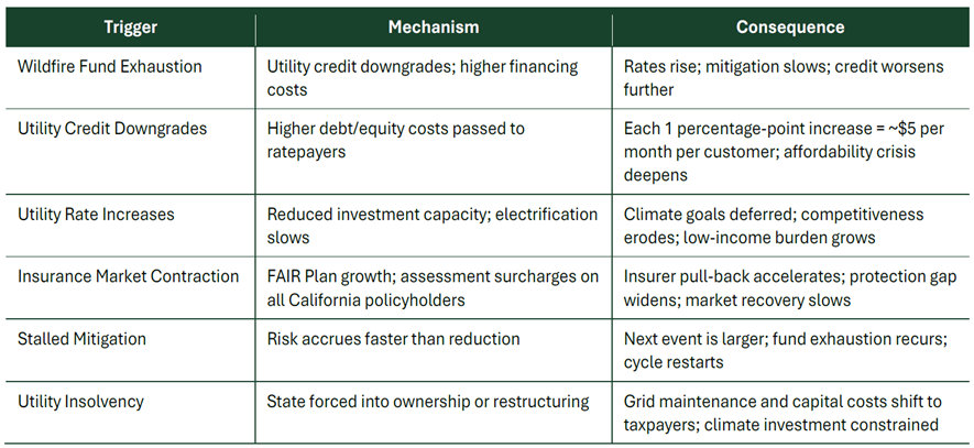Figure 2 summarizes the systemic nature of the problem, including the cascading consequences that ratepayers, homeowners, and communities remain exposed to in the absence of action to improve the state’s wildfire resilience.