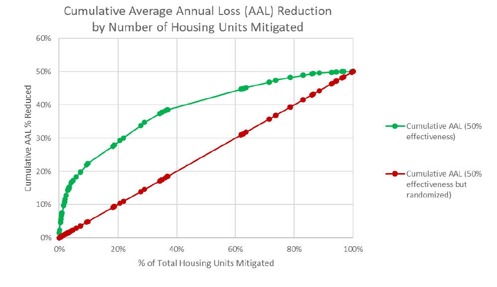 Figure 4: Shows how average losses from home mitigation are substantially reduced as part of a coordinated regional strategy (green) vs. uncoordinated or randomized strategy (red). Significant gains can be achieved for the first 10% of homes mitigated. Source: SB 254 Report
