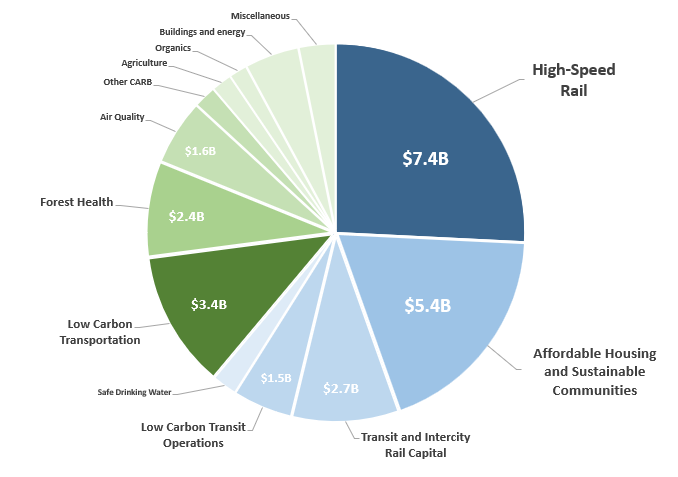 California’s cap-and-invest program is a key source of funding for multiple state programs. Since the first auction in 2013, the program has generated more than $50 billion in revenue, split roughly 40% ($20 billion) as a rebate to electricity ratepayers and 60% ($30 billion) to various environmental programs as part of the GGRF. A specific set of 'continuous' programs, including High-Speed Rail ($8B), Affordable Housing and Sustainable Communities ($5B), and Transit ($4B), have received the majority of GGRF to date. The remaining funding ($12B) has been shared across roughly 90 other programs (Figure 3).