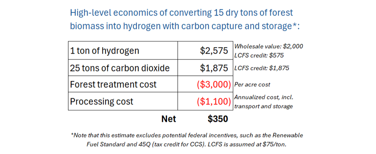 Figure 6: Back-of-the-envelope techno-economic estimate of a carbon-negative hydrogen facility shows how advanced technologies have favorable economics that could cover the cost of forest treatments.