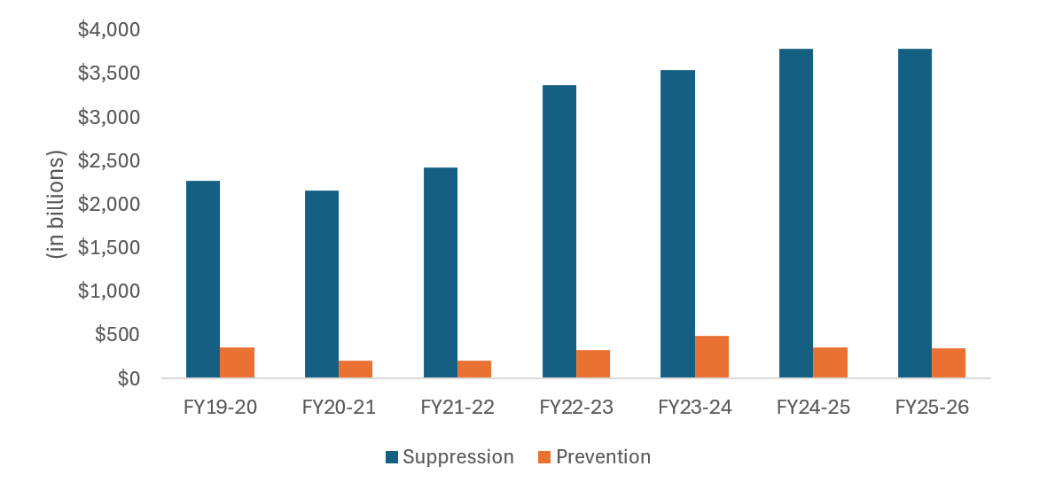 For example, state government spending on wildfire is overwhelmingly weighted towards suppression (firefighting) over prevention. In 2025-26, the state spent a total of $4.1B on wildfire, split $3.75B (or 91%) on suppression and $0.35B (or 9%) on prevention (Figure 1). Note that roughly the same allocations have been proposed in the Governor’s 2026-27 budget. Since 2019-20, annual suppression spending has increased by about $1.5B. In contrast, prevention spending – despite an increase in 2023-24 – is largely the same. A $200M continuous allocation from cap-and-invest proceeds (established in 2022-23) created some stability for prevention funding but has not meaningfully increased it.