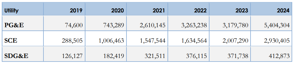 Figure 2: Summary of IOU wildfire spending, including vegetation management, insurance, and infrastructure upgrades. 2019 totals $489M. 2024 totals $8.75B. Excluded from the table is an additional approx. $1B per year that is ratepayer contribution to the Wildfire Fund. Source: CPUC.
